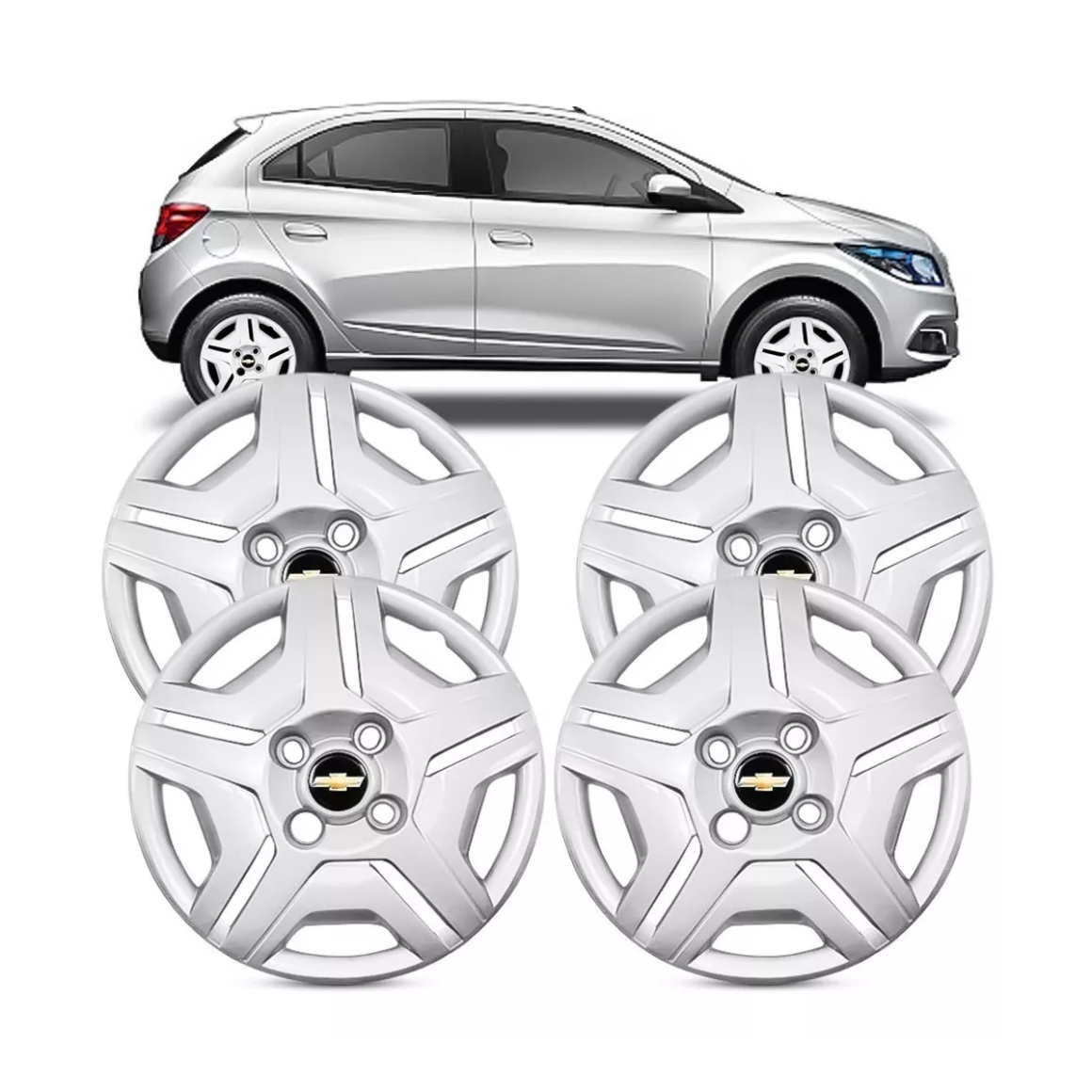 JOGO CALOTA ONIX PRISMA 2014 2015 2016 JOY 2017 2018 PRATA ARO 14” + EMBLEMA CHEVROLET